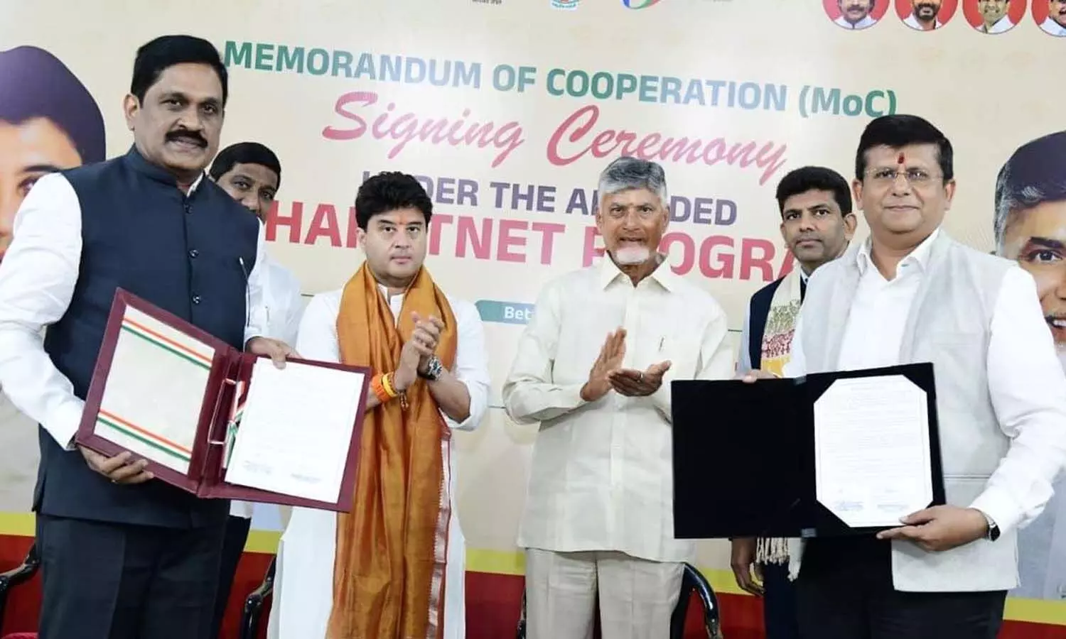ఆంధ్రప్రదేశ్ రాష్ట్రంలోని మారుమూల గ్రామాల వరకు హై-స్పీడ్ ఇంటర్నెట్ సదుపాయాన్ని అందించే లక్ష్యంతో 'సవరించిన భారత్ నెట్' ప్రాజెక్టుపై ఆదివారం కీలక ఒప్పందం జరిగింది. ఉండవల్లిలోని ముఖ్యమంత్రి క్యాంప్ కార్యాలయంలో ముఖ్యమంత్రి నారా చంద్రబాబు నాయుడు, కేంద్ర సమాచార శాఖ మంత్రి జ్యోతిరాదిత్య సింధియా, కేంద్ర సహాయ మంత్రి పెమ్మసాని చంద్రశేఖర్, రాష్ట్ర మంత్రి బి.సి. జనార్దన్ రెడ్డి సమక్షంలో ఈ అవగాహన ఒప్పందం కుదిరింది. డిజిటల్ భారత్ నిధి అడ్మినిస్ట్రేటర్ శ్యామల్ మిశ్రా, రాష్ట్ర మౌలిక సదుపాయాల శాఖ ప్రత్యేక ప్రధాన కార్యదర్శి ఎం.టి. కృష్ణబాబు ఈ ఒప్పందంపై సంతకాలు చేశారు. ఈ ప్రాజెక్టు కోసం కేంద్ర ప్రభుత్వం రూ. 2,432 కోట్లు కేటాయించింది. రాష్ట్రవ్యాప్తంగా ఉన్న 13,426 గ్రామ పంచాయతీలకు బ్రాడ్బాండ్ కనెక్టివిటీని అందించడం లక్ష్యం. ఈ ప్రాజెక్టును అమలు చేయడానికి 'ఆంధ్రప్రదేశ్ భారత్ నెట్ ఇన్ఫ్రాస్ట్రక్చర్ లిమిటెడ్' అనే ప్రత్యేక సంస్థను రాష్ట్ర ప్రభుత్వం ఏర్పాటు చేసింది.
