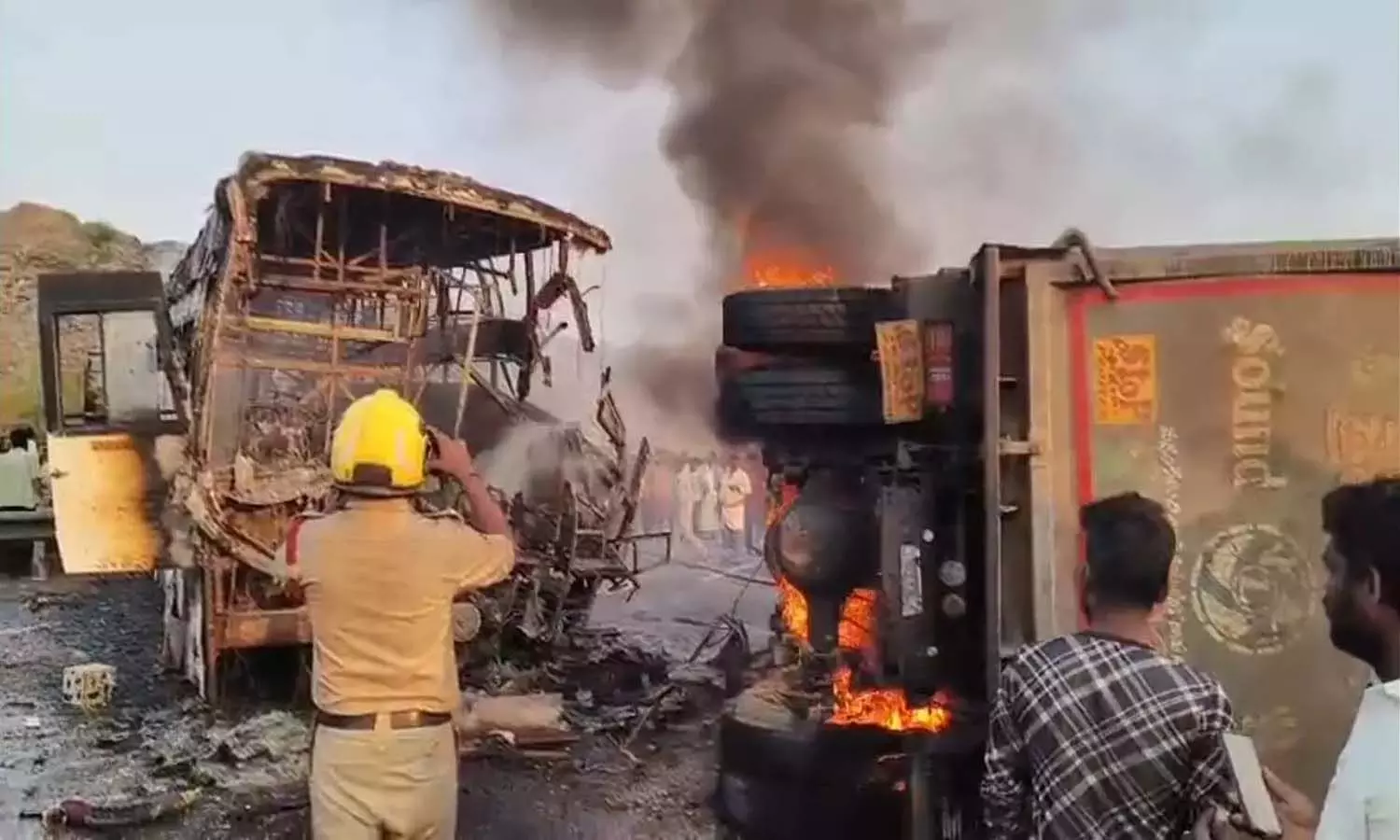 ప్రకాశం జిల్లా రాయవరం సమీపంలో గురువారం తెల్లవారుజామున అత్యంత భీకరమైన రోడ్డు ప్రమాదం సంభవించింది. జగిత్యాల నుండి నెల్లూరు జిల్లా కళిగిరికి వెళ్తున్న చందూ ట్రావెల్స్ ప్రైవేట్ బస్సు, ఎదురుగా వస్తున్న టిప్పర్ లారీని బలంగా ఢీకొనడంతో ఈ ఘోరం జరిగింది. ఈ ప్రమాదం జరిగిన వెంటనే రెండు వాహనాల్లో మంటలు చెలరేగగా, నిద్రలో ఉన్న ప్రయాణికులు బయటకు వచ్చే అవకాశం లేక కనీసం 14 మంది సజీవదహనమయ్యారు. మంటలు క్షణాల్లోనే వాహనాలను చుట్టుముట్టడంతో మృతుల సంఖ్య పెరిగినట్లు తెలుస్తోంది. బస్సులో సుమారు 35 మంది ప్రయాణికులు ఉండగా, బస్సు డ్రైవర్ మరియు టిప్పర్ డ్రైవర్తో సహా మరో 23 మంది తీవ్ర గాయాలపాలయ్యారు. క్షతగాత్రులను వెంటనే సమీపంలోని ఆసుపత్రులకు తరలించి చికిత్స అందిస్తున్నారు.