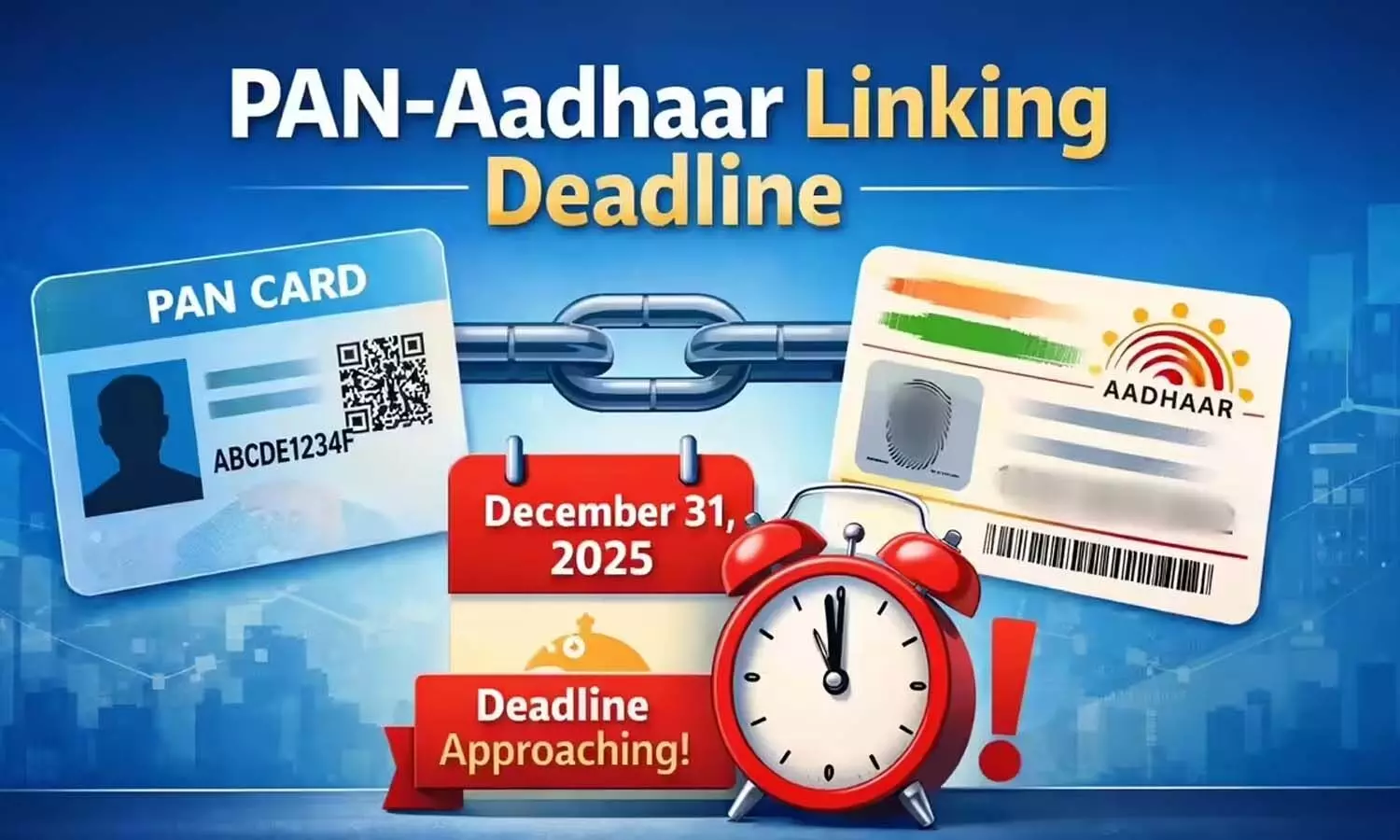 మీ పాన్-ఆధార్ కార్డ్ లింకేజీని పూర్తి చేయడానికి చివరి తేదీ డిసెంబర్ 31, 2025. జనవరి 1, 2026 నుండి, ఆదాయపు పన్ను శాఖ లింక్ చేయని అన్ని పాన్లను పనిచేయనివిగా ప్రకటిస్తుంది. ఏప్రిల్ 3, 2025న జారీ చేయబడిన నోటిఫికేషన్ నంబర్ 26/2025 ప్రకారం, అక్టోబర్ 1, 2024కి ముందు ఆధార్ ఎన్రోల్మెంట్ ఐడిని ఉపయోగించి పాన్ కేటాయించబడిన వ్యక్తులు 2025 చివరి నాటికి వారి శాశ్వత ఆధార్ కార్డ్ నంబర్ను ఉపయోగించి లింక్ను పూర్తి చేయాలి. గడువులోగా లింక్ చేయని పాన్ కార్డులు నిష్క్రియంగా లేదా పనిచేయనివిగా గుర్తించబడతాయి. పన్ను సంబంధిత లేదా ప్రధాన ఆర్థిక లావాదేవీలకు ఉపయోగించబడవు.