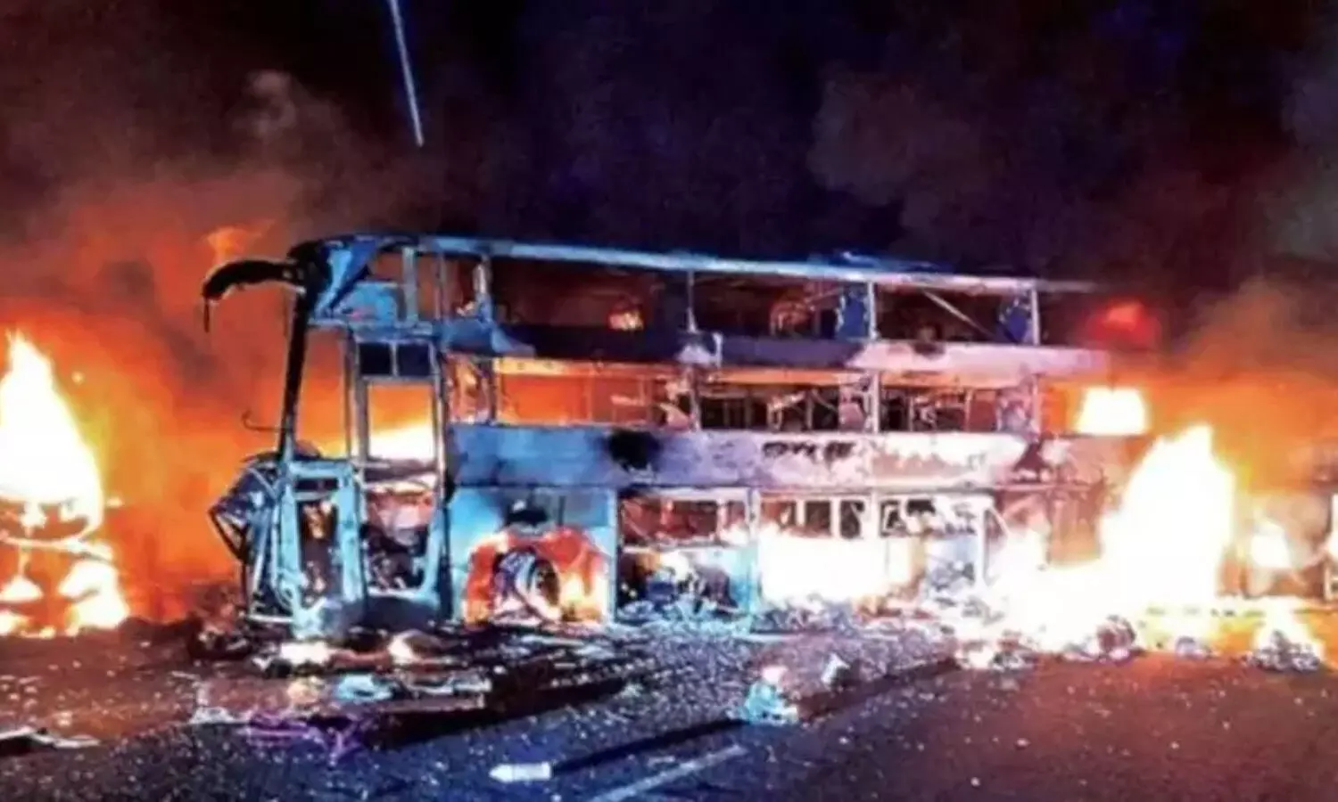 టైరు పగలడంతో డ్రైవర్ బస్సుపై నియంత్రణ కోల్పోయి అదుపు తప్పి డివైడర్కు అడ్డంగా పడి ఎదురుగా వస్తున్న కంటైనర్ లారీని ఢీకొట్టింది. ఈ ప్రభావంతో భారీగా మంటలు చెలరేగడంతో రెండు వాహనాలు దగ్ధమయ్యాయి. మృతుల్లో బస్సు డ్రైవర్, లారీ డ్రైవర్, లారీ క్లీనర్ మృతదేహాలు గుర్తుపట్టలేనంతగా కాలిపోయాయి. అయితే మంటలు ఎగిసిపడుతున్న సమయంలో అటుగా వెళ్తున్న డీసీఎం వాహన డ్రైవర్ వెంటనే స్పందించాడు. తన వాహనాన్ని ఆపి, బస్సు అద్దాలను పగులగొట్టి ప్రయాణికులను బయటకు రావాలని సూచించాడు. దీంతో ప్రయాణికులు కిటికీల నుంచి దూకి ప్రాణాలు కాపాడుకున్నారు. అయితే కిటికీల నుంచి దూకే క్రమంలో పదిమందికి పైగా ప్రయాణికులకు స్వల్ప గాయాలయ్యాయి. మంటలు తీవ్రతరం కావడంతో లారీ కూడా పూర్తిగా కాలిపోయింది.