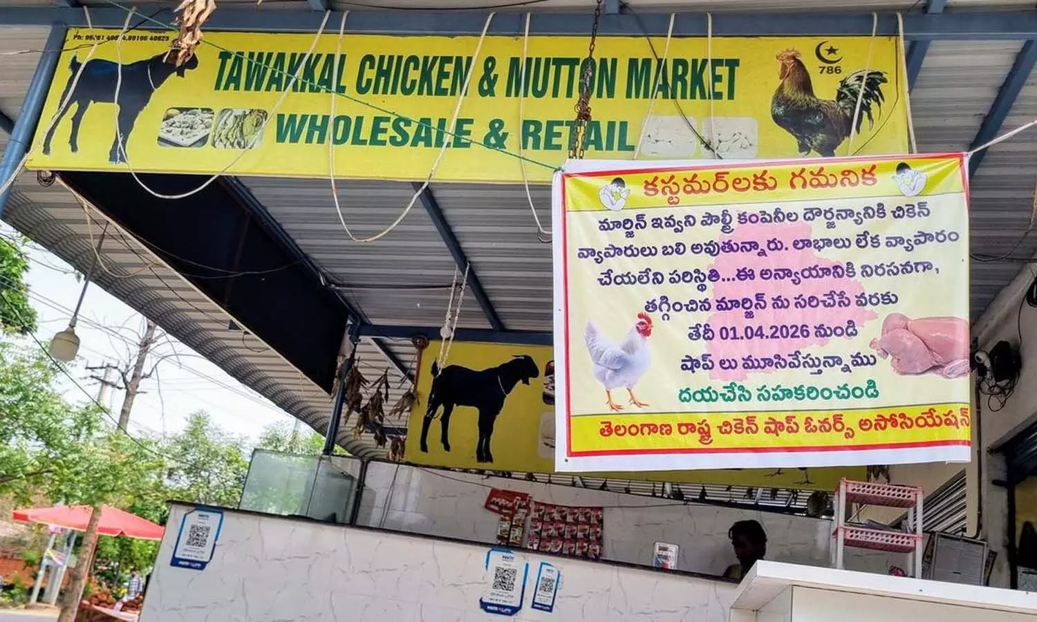 హైదరాబాద్లోని మల్లాపూర్ పరిధిలో ఉన్న బాబా నగర్ కాలనీలోని 'తవక్కల్ చికెన్ అండ్ మటన్ మార్కెట్' బయట వెలిసిన ఒక బ్యానర్ ఇప్పుడు స్థానికంగా చర్చనీయాంశమైంది. తెలంగాణ స్టేట్ చికెన్ షాప్ ఓనర్స్ అసోసియేషన్ పేరుతో ఉన్న ఈ నోటీసులో, చికెన్ వ్యాపారులు ఎదుర్కొంటున్న ఇబ్బందులను వివరిస్తూ ఏప్రిల్ 1 నుంచి నిరవధికంగా షాపులను మూసివేస్తున్నట్లు ప్రకటించారు.