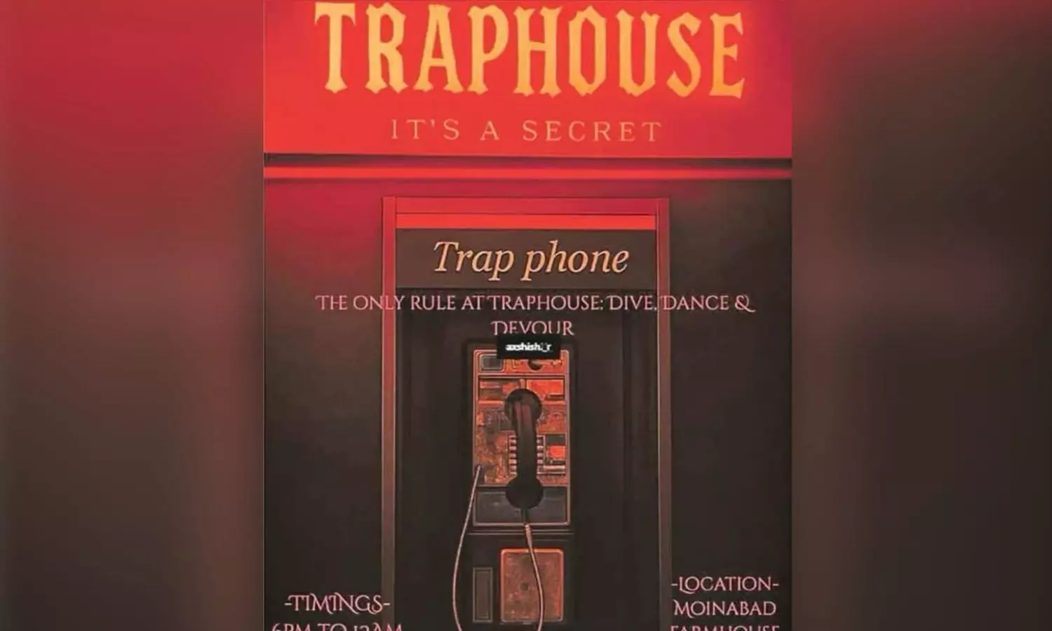 మొయినాబాద్లోని ఒక ఫామ్హౌస్లో దాదాపు 50 మంది మైనర్లతో జరిగిన రహస్య `ట్రాప్ హౌస్ పార్టీ'ని రాజేంద్రనగర్ SOT పోలీసులు ఛేదించారు. ఈ ఈవెంట్ను హైదరాబాద్కు చెందిన ఒక డీజే నిర్వహించారని, అతను 'ట్రాప్ హౌస్.9mm' అనే హ్యాండిల్ కింద ఇన్స్టాగ్రామ్ ద్వారా సమావేశాన్ని ప్రమోట్ చేశాడని పోలీసులు తెలిపారు.