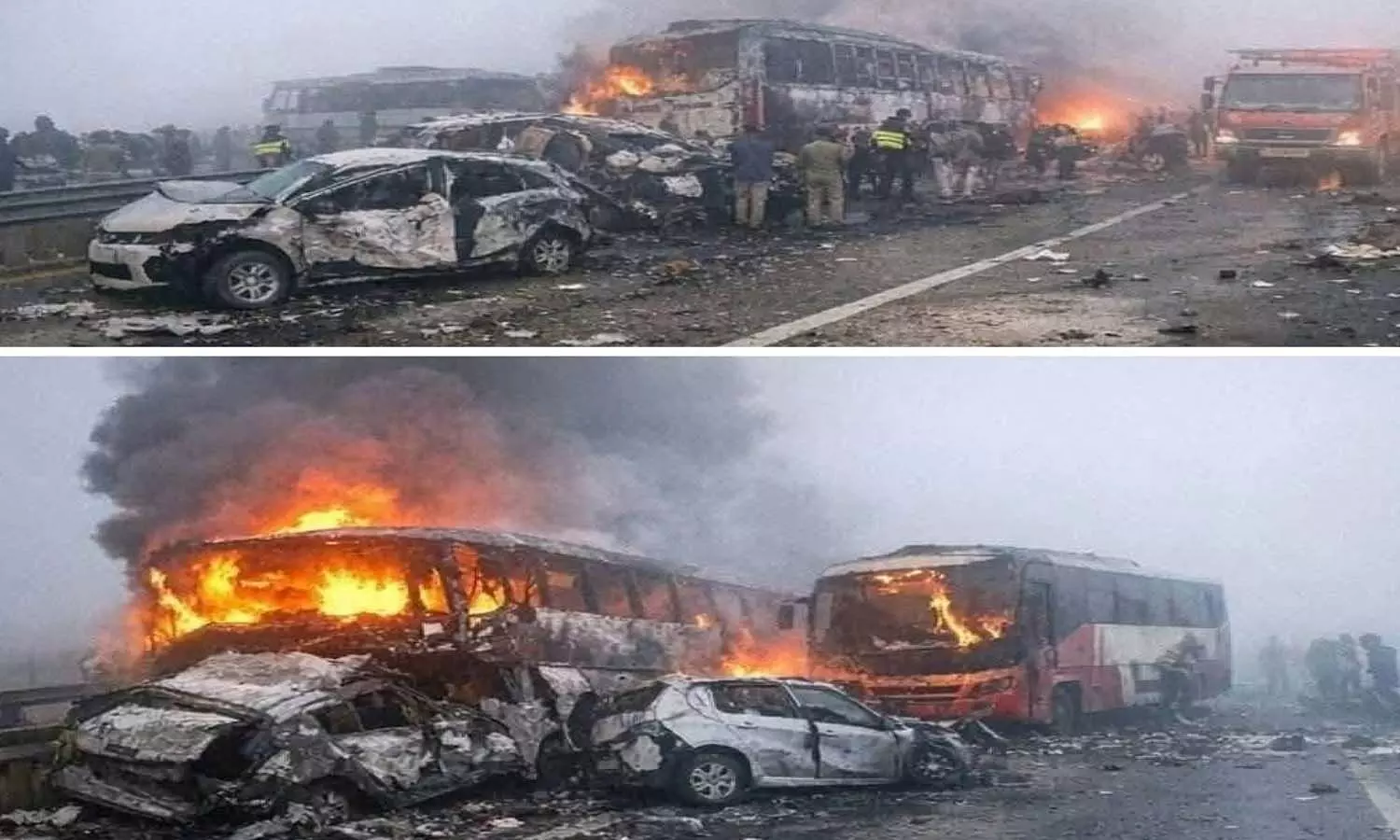 దట్టమైన పొగమంచు కారణంగా దృశ్యమానత సరిగా లేకపోవడం వల్ల వాహనాలు ఒకదానికొకటి ఢీకొన్నాయి, భారీ మంటలు చెలరేగాయి, బస్సులు మరియు కార్లు నిమిషాల్లోనే దగ్ధమయ్యాయి, డ్రైవర్లు స్పందించడానికి చాలా తక్కువ సమయం లేదా సమయం కేటాయించలేకపోయారు. ఆ ప్రభావం చాలా తీవ్రంగా ఉండటంతో అన్ని వాహనాలు దాదాపు తక్షణమే మంటల్లో చిక్కుకున్నాయి, ప్రయాణికులు లోపల చిక్కుకున్నారు మరియు సంఘటన స్థలంలో భయాందోళనలు చెలరేగాయి. ఒక వాహనం నుండి మరొక వాహనంలోకి మంటలు వేగంగా వ్యాపించడంతో గందరగోళం నెలకొందని ప్రత్యక్ష సాక్షులు వివరించారు.