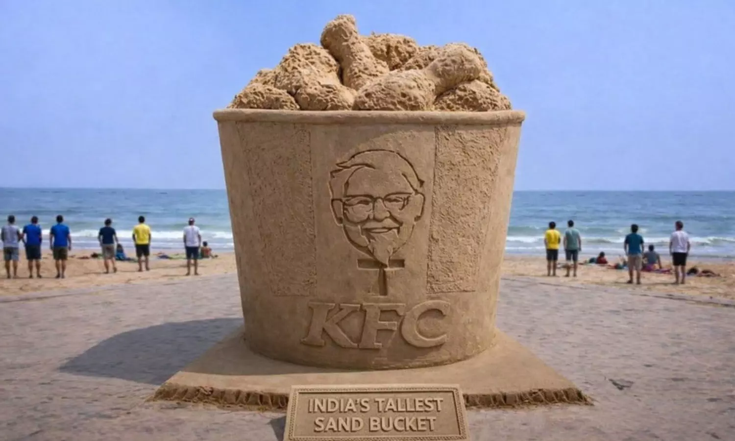 విశాఖపట్నంలోని ఆర్కే బీచ్ అంటేనే ఎన్నెన్నో విశేషాలు- ఉవ్వెత్తున ఎగిసిపడే అలలు, ఉదయపు నడకలు, సాయంత్రపు విహారాలు, అప్పుడప్పుడు కనిపించే ఇసుక కోటల సమాహారం.కానీ ఈ వారం, ఇసుకతో భారీ పరిమాణంలో కేఎఫ్సీ బకెట్ ఒకటి ఆవిర్భవించడంతో బీచ్కు వచ్చినవారు ఆశ్చర్యానికి లోనయ్యారు. స్థానిక స్యాండ్ ఆర్టిస్ట్ ఆకునూరు బాలాజీ వరప్రసాద్ కేవలం బీచ్ ఇసుకను మాత్రమే ఉపయోగించి, 48 గంటల పాటు శ్రమించి దీన్ని రూపొందించారు. ఈ అద్భుతమైన కళాఖండాన్ని రూపొందించేందుకు 7టన్నులకు పైగా ఇసుకను వినియోగించారు. ఈ కళాఖండం ప్రపంచంలోనే అత్యంత గుర్తింపు పొందిన బ్రాండ్ చిహ్నాలలో ఒకటిగా మార్చింది.ఆకునూరు బాలాజీ వరప్రసాద్ శిల్పి మరియు ఒక ప్రఖ్యాత స్యాండ్ ఆర్టిస్ట్. ఆయన ఆంధ్రప్రదేశ్లోని పేరుపాలెం, మంగినపూడి, బాపట్ల బీచ్లతో పాటు భారతదేశంలోని పలు బీచ్లలో 700కు పైగా ఇసుక శిల్పాలను రూపొందించారు. ఆయన కోనార్క్ అంతర్జాతీయ ఇసుక కళా ఉత్సవంలో నాలుగుసార్లు విజేతగా నిలిచారు. ఖతార్, యూరప్లలో నిర్వహించిన అంతర్జాతీయ స్యాండ్ ఆర్ట్ పోటీలలో భారతదేశానికి ప్రాతినిధ్యం వహించారు.