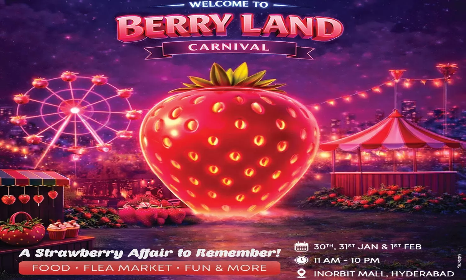 స్ట్రాబెర్రీ సీజన్ ను వేడుక చేస్తూ సైబరాబాద్ లోని ఇనార్బిట్ మాల్ లో బెర్రీ ల్యాండ్ కార్నివాల్ నిర్వహిస్తున్నారు. మూడు రోజుల పాటు జరుగనున్న ఈ వేడుకతో మాల్ గులాబీ రంగులోకి మారనుంది. జనవరి 30 నుండి ఫిబ్రవరి 1, 2026 వరకు జరిగే ఈ కార్నివాల్ ఆహారం, సృజనాత్మకత, షాపింగ్ మరియు వినోదాన్ని మిళితం చేస్తూ లీనమయ్యే అనుభవాన్ని అందిస్తుంది.