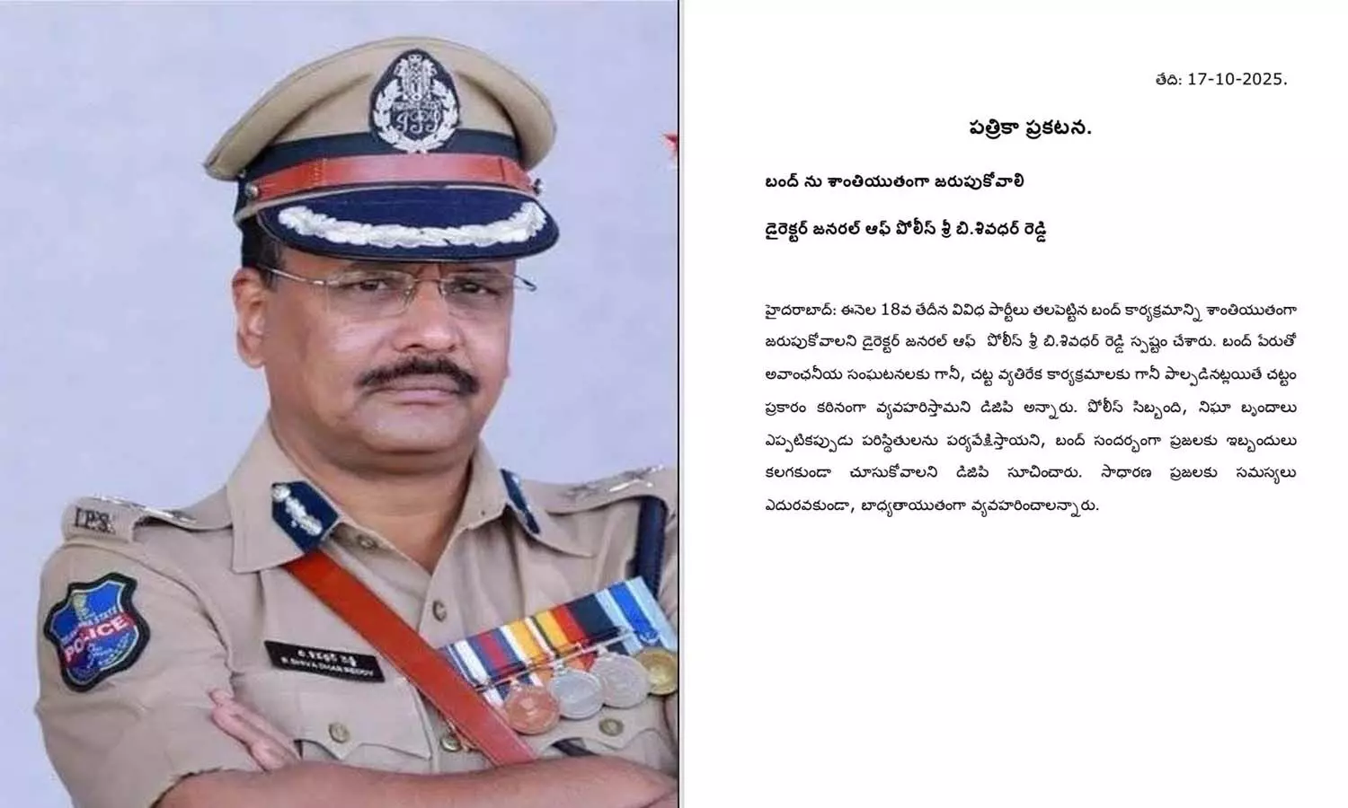 హైదరాబాద్: ఈనెల 18వ తేదీన వివిధ పార్టీలు తలపెట్టిన బంద్ కార్యక్రమాన్ని శాంతియుతంగా జరుపుకోవాలని డైరెక్టర్ జనరల్ ఆఫ్ పోలీస్ బి.శివధర్ రెడ్డి స్పష్టం చేశారు. బంద్ పేరుతో అవాంచనీయ సంఘటనలకు గానీ, చట్ట వ్యతిరేక కార్యక్రమాలకు గానీ పాల్పడినట్లయితే చట్టం ప్రకారం కఠినంగా వ్యవహరిస్తామని డిజిపి అన్నారు. పోలీస్ సిబ్బంది, నిఘా బృందాలు ఎప్పటికప్పుడు పరిస్థితులను పర్యవేక్షిస్తాయని, బంద్ సందర్భంగా ప్రజలకు ఇబ్బందులు కలగకుండా చూసుకోవాలని డిజిపి సూచించారు. సాధారణ ప్రజలకు సమస్యలు ఎదురవకుండా, బాధ్యతాయుతంగా వ్యవహరించాలన్నారు.